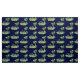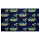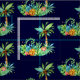 Tropical Palm Trees and Floral on Navy - zeigt exotische Blumenelemente und tropische Vegetation von Paradies-, Plumeria- und Ananas, in den Tönen Rosa, Gelb, Grün und Orange.