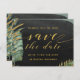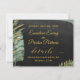 Eine elegante Aquarellmalerei mit tropischer Hochzeitseinladung mit einem dramatischen, schwarzen Aquarellwaschbecken mit exquisit bemalten grünen Palmen-Blätter und schimmernden Goldakzenten. Eine lebendige Goldswash-Skript-Kalligraphie kündigt Ihre Hochzeitsdetails an.