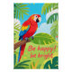 Ein lebendiger roter Ara mit Regenbogenflügeln sitzt auf üppigen Dschungelblättern neben dem aufmunternden handgeschriebenen Satz „Sei glücklich, sei hell“, vor einem sonnigen blauen Himmel für fröhliche tropische Vibes. Spielender Illustrationsstil und eine kühne Farbpalette machen es ideal für Kinderzimmer, Klassenzimmer und sonnige Heimdekoration, die Positivität feiert. Optimiert mit klaren Themen-, Farb- und Stil-Schlagwörtern für eine starke Zazzle-Erkennung.