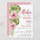 Auf der links Hälfte befindet sich ein Aquarell mit tropischen Blume und Blätter: Monstera und Palmen Blätter und rosa Hibiskus. Der Text ist rechts. Der Titel "Aloha", der Anlass "Probe Dinner" und die Namen sind in einem dunkelrosa ähnlich in Farbe mit den Hibiskus Blume, die Erholung in schwarz geschrieben. Der Titel ist in einer Handschrift Skript, die Erholung in Handbuchstaben (alle Kappen). Die tropischen Blätter und die Blume sind Aquarellfarben, die von laomao_art aus Pixabay gemalt wurden und für kommerzielle Nutzung frei sind.