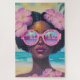 atemberaubendes und lebendiges Porträt einer stilvollen Frau, die eine übergroße rosa Sonnenbrille trägt, die einen traumhaften tropischen Strand widerspiegelt. Umgeben von sanften Hibiskus-Blume und Set vor einem türkisfarbenen Ozean-Hintergrund, spiegelt dieses Kunstwerk das Wesen von Sommer, Schönheit und Ermächtigung wider. Ideal für Strandliebhaber, Sammler von Modekunst und tropische Dekoration.