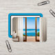 Offene Tür mit weißen Vorhängen und Holzterrasse mit Blick auf eine tropische Szene.