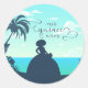 Feiern Sie Ihren großen Tag mit Ihren Freunden und Ihrer Familie und dekorieren Sie Ihre Einladungen oder bevorzugen Sie Taschen mit diesem eleganten Aufkleber. Eine charroische Silhouette eines Quinceanera-Mädchens ziert die Vorderseite, umgeben von Palmen mit Wasser und Himmel im Hintergrund. Ideal für einen Strand oder ein tropisches Thema. Personalisieren Sie mit allen Details für den Massenservice und die 15. Geburtstagsparty. Erhältlich auch mit einer standardmäßigen Ballgown-Silhouette. Koordinierung der Einladungen und Party. Auch geeignet für eine 16 . Geburtstag Veranstaltung.