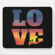 Ein tropischer Strand ist der perfekte Ort für Liebe! Schönes knockout Texteffekt Mauspad mit gestapelten Buchstaben des Wortes LIEBE. Eine farbenfrohe tropische Sonnenuntergangsszene mit Palmen in der Silhouette zeigt durch die Blockbuchstaben auf schwarzem Hintergrund.