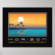 Horizon tropischen Sonnenuntergang, Palmen, Ozean motivierend Poster Druck, mit einer idyllischen tropischen Landschaft der untergehenden Sonne, mit dem Horizont Linie, Palmen, Vögel das Meer mit Reflektionen und Vögel. Der Himmel ist in roten Orangetönen und der Horizont in lila Grau. Es ist eine Vorlage mit dem Zitat "H O R I Z O N: DREAM OF IT. Es spielt keine Rolle, dass Sie es NIE ERREICHEN" Sie können Text ändern und ein Zitat oder ein Gedicht hinzufügen. Man kann es auch demotivierend machen.