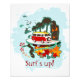 Eine unterhaltsame und moderne Illustration einer tropischen Strandlandschaft mit Palmen, Ozeansurfen mit Surfern, eine schöne, mit Bikini verkleidete Frau, wunderschöne Blume und einen alten Hippie-Bus. Das Hotel liegt sehr zentral und trotzdem ruhig.