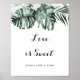 Diese Liebe mit tropischer Vegetation ist ein hübsches Zeichen für eine rustikale Hochzeit oder ein Brautparty. Die Einrichtung besteht aus grünen Palmenbouquets mit hübschen weißen Blume.