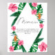 Tropical Palms Watercolor Bridal Dusche Einladung. Das Design besticht durch ein elegantes Bouquet mit klassischen Strandfarben und Blume, darunter rosafarbener Hibiskus, orangefarbene und blaue Paradiesvögel, grüne Vegetation und dunkelgrünes Palmenblatt.