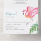 Neue moderne botanische Einladung in zeitgenössischem Design. Details sind Set in einer trendigen Handschrift Schrift Typografie in Meerglasblau mit einem traditionellen Serifen Gesicht Schriftart. Eine Nachbildung meiner originalen handgemalten rosa Flamingo und tropischen Florida grünen Monstera Blätter rahmen Ihre Hochzeitsdetails. Passen Sie jede Klappe mit Ihren persönlichen Daten an. Ideal für tropische Hochzeiten am Strand oder für eine einfache, elegante, luxuriöse Hochzeit. Weitere tropische Hochzeitseinladungen von Victoria Grigaliunas finden Sie unter www.zazzle.com/dotellabelle