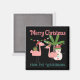 Dieser individuelle Weihnachtsmagnet zeichnet sich durch eine niedliche Cartoon-Illustration aus. Zwei rosa Flamingos haben ein Party mit Geschenken und Weihnachtsbeleuchtung. Ein niedlicher Schneemann ist vor einer tropischen Palme stehend. Der Hintergrund ist schwarz.
