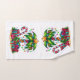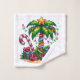 Handtuch Set mit einem saisonalen Urlaubsbild. Eine tropische Palme, die mit festlichen Lichtern dekoriert ist und auf der ein Stern steht. Ein riesiger, rot-weißer Bonbons, der aus dem Sand ragt. Weihnachten präsentiert sich unter dem Baum. Whimsical und lustig.