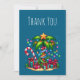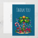 Vielen Dank Karte mit einem saisonalen Urlaubsbild. Eine tropische Palme, die mit festlichen Lichtern dekoriert ist und auf der ein Stern steht. Ein riesiger, rot-weißer Bonbons, der aus dem Sand ragt. Weihnachten präsentiert sich unter dem Baum. Whimsical und lustig.