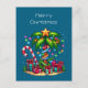 Weihnachts-Postkarte mit saisonalem Urlaubsimage. Eine tropische Palme, die mit festlichen Lichtern dekoriert ist und auf der ein Stern steht. Ein riesiger, rot-weißer Bonbons, der aus dem Sand ragt. Weihnachten präsentiert sich unter dem Baum. Whimsical und lustig.