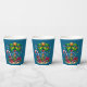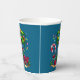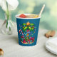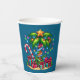 Papiertassen mit einem saisonalen Urlaubsbild. Eine tropische Palme, die mit festlichen Lichtern dekoriert ist und auf der ein Stern steht. Ein riesiger, rot-weißer Bonbons, der aus dem Sand ragt. Weihnachten präsentiert sich unter dem Baum. Whimsical und lustig.