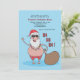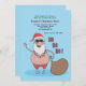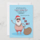 Die perfekte tropische Weihnachtszeit-Party Einladung! Der blaue Hintergrund zeigt den Weihnachtsmann in seinem Anzug und Hut, der eine Blume Lei trägt, eine Sonnenbrille trägt und seinen Sack hält.