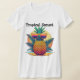 Dieses lebendige T - Shirt-Design besticht durch einen stilisierten Ananas, der vor dem Hintergrund eines tropischen Sonnenuntergangs eine Sonnenbrille trägt. Die Ananas ist mit einem strukturierten Muster detailliert, und die Sonnenbrille reflektiert die lebendigen Farben des Sonnenuntergangs. Palmfronten umrahmen die unteren Seiten des Bildes und verstärken sein tropisches Thema.