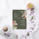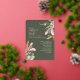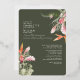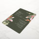 Modernes Design mit tropischer Vegetation und Blume in gedämpften Farbtönen und eine Touch Rose Gold auf dunkelgrünem Hintergrund kombiniert mit einer eleganten Kalligraphie Typografie, für ein elegantes Aussehen. Auf der Rückseite ist die Einladung mit einer Vorlage für Ihre Hochzeitsdetails und UAWG QR-Code beendet. Wählen Sie zwischen Gold, Rose oder Silberfolie.