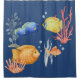 Dieser Duschvorhang bietet ein künstlerisches Aquarium. Vier farbenfrohe tropische Fische, Korallen und Pflanze sind über einem dunkelmarineblauen Hintergrund verteilt.