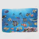 Tropischer Fisch schwimmen Meeresgrund, es ist Zeit, unter dem Meer zu Party. Die Unterwasserszene ist belebt und chaotisch, mit tropischen, schwarz-weiß gestreiften Fischen gemischt mit Goldfischen. Genießen Sie die Erinnerungen des Schnorchelns mit einem lebhaften Unterwasserfoto von seichten Gewässern mit tropisch blauen Schalen, Schnecken und Oktopus-Set vor dem Hintergrund der grünen Korallen.
