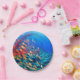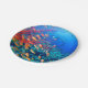 Tauchen Sie ein in die lebendigen tropischen Fische! Orangefarbene tropische Fische schwimmen um die Meereskorallen unter der Meeresoberfläche. Im Vordergrund dieses tropischen Unterwasser-Fotos wird hellrote Meereskoralle gesehen.