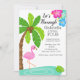 Uns gelassen Flamingle mit dieser Geburtstagseinladung. Es gibt einen Flamingo, der im Wasser unter eine große, schöne Palme das stehend ist. Personifizieren Sie mit Ihren Partyinformationen.