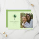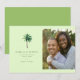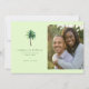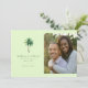 Diese Hochzeit-Save-the-Date-Karte zeigt ein geteiltes Layout mit einem hellgrünen Hintergrund auf einer Seite, auf dem eine detaillierte Illustration einer Palme zu sehen ist. Die andere Seite enthält einen warmen, softfokussierten Fotoplatzhalter von zwei Personen, die sich umarmen, was einen intimen Moment andeutet. Das Design verwendet klassische Serifenschriften für eine verfeinerte Note und eine gedämpfte Farbpalette, um ein tropisches, aber elegantes Thema zu schaffen. Perfekt, um Wärme und Freude auszudrücken, ist diese Vorlage ideal für Paare, die ihre Vereinigung in einer ruhigen Atmosphäre feiern.