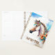 Ein wunderschönes Aquarellbild des Kopfes eines weißen Pferdes mit einer beigen, braunen Mähne, gefüllt mit hübschen lila Rose; orangefarbener Hibiskus und Blattwerk verlasse Set vor einem dunkelweißen Hintergrund. Das Pferd wird von zarten blauen Wolken gerahmt, und unten erscheint ein Template für Ihren Namen in einem fett braunen Schriftart mit einem Imitat rosa Fallschatten. Ideal für Pferdefreunde und Reitfreunde.