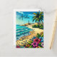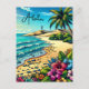 Aloha aus unserer Ferienkarte. Hübsche tropische Küstenlinie. Hübsches blaues Wasser, Palmen, tropische Blume und ein Leuchtturm im Hintergrund. Ai art made in a Comic Buch Pop Art Stil.