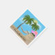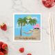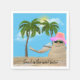 Niedlicher tropischer Sandmann mit Sonnenbrille und rosa Sonnenmütze im Sand mit Hängematte und Palmen.