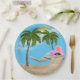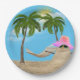 Niedlicher tropischer Sandmann mit Sonnenbrille und Hut im Sand mit Hängematte und Palmen.