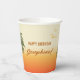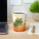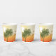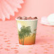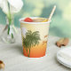 Serviere Getränke im tropischen Stil mit Desteis lebendigem Design auf Papiertassen. Grüne Palmensilhouetten stehen gegen einen strahlenden orange-gelben Sonnenuntergangshimmel, während drei Vögel am Himmel fliegen. Füge eine persönliche Note mit deinem eigenen Text hinzu, um jeden Schluck besonders zu machen.