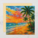 Dieses lebendige Aquarellbild fasziniert die ruhige Schönheit eines tropischen Strandes bei Sonnenuntergang. Brillante Orange-, Rot- und Gelbtöne versetzen den Himmel und fügen sich nahtlos in die tiefe Blues der Meereswellen ein. Große Palmen umrahmen den Vordergrund, mit subtilen Schatten über dem warmen Sandstrand. Die Szene ruft ein Gefühl von Ruhe, Entspannung und Naturwunder hervor, was sie zu einer perfekten Darstellung des Paradieses macht.