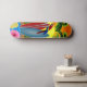 Tropischer und bunter Ozeansonnenuntergang hinter Surfbrettern, Palmen, ein Macawpapagei hockte auf den Brandungsbrettern und den Hibiskus-Blumen an der Unterseite.