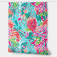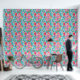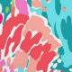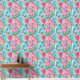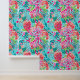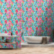 Ein nahtloses, präpariertes Muster mit rosa, orangefarbenen, korallenfarbenen und roten Blume auf einem minziös grünen Hintergrund mit rundem Farbspritzen und weißen Punkten. Das Design ist handbemalt und verbindet lebendige Blumenelemente mit strahlender Pracht, um einen lebendigen und stilvollen Effekt zu erzielen.