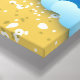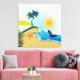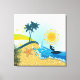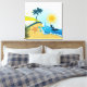 Tropischer Strand, Ozean mit Surfgeflecht Leinwand gedruckt, mit einer tropischen Landschaft. Am Sandstrand stehen Palmen und Seesterne, ein Surfer auf den Wellen und eine knorchelförmige Sonne aus Kreisen.