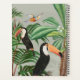 Ein wunderschönes tropisches Walddesign in Aquarelltönen mit wilden Vögeln. Dieses tropische Walddesign ist ideal für alle, die tropische Landschaften, tropische Toucans und farbenfrohe Vögel, grüne Pflanze, Palmen und tropische Blattbilder Lieben. Perfektes Zuhause-Dekor oder Geschenk.