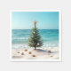Ein kleiner Weihnachtsbaum mit Muscheln auf einem Sandstrand, der von sanften Ozeanwellen umgeben ist