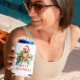 Dieses tropische Thema Weihnachten kann cooler Design zeigt einen tropischen Vogel mit einer Weihnachtsmannmütze Urlaub Grün und Rot Retro Frohe Weihnachtstypografie.
