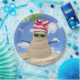 Ein tropischer Weihnachtssandschneemann mit rot-weiß gestreiften Strümpfen und grüner Sonnenbrille auf Sand.