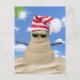 Ein tropischer Weihnachtssandschneemann mit rot-weiß gestreiften Strümpfen und grüner Sonnenbrille auf Sand. Familienname kann bearbeitet oder gelöscht werden.