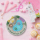 Desteis Darstellung einer Hinterhofszene, die eine Art Avocado-Schwimmbad in sich hat. Im Pool gibt es einen rosa Schwimmring und einen grünen Schwimmring. Am Rand des Pools befindet sich eine lila Matratze. In der oberen Ecke befindet sich ein weißer und gelb gestreifter Sonnenschirm. Unter dem Regenschirm befindet sich ein brauner runder Tisch mit einem orangefarbenen Getränk und einem Obstteller. Zu den Früchten zählen eine Wassermelone-Scheibe, eine orangefarbene Scheibe und drei Erdbeeren. Um den Pool herum gibt es auch eine schwarze Sonnenbrille. An den Kanten des Designs befinden sich grüne Blätter aus Palmen und der Boden ist eine lustige Grasstruktur und Stein, die die Hinterhofsszene miteinander verbindet. Es gibt auch einen personalisierbaren Textbereich.