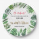 Tropisches Blattwerk und goldene Wirkung Tiere duftende oder mehrfache Baby Dusche Party Papier Teller. Handgemalte Wasserfarbenfolien, Skripttext und Goldtiere machen dies zu einem lustigen, modernen Babyduschthema.