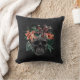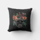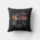 Ein wunderschönes Halloween-Design mit einer tropischen, blumengeschmückten Skulptur mit orangefarbenen und bordeauxfarbenen Blume und grünem Dschungelblätterdach auf einem rauchigen schwarzen Hintergrund.