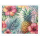 "Tropical Bloom" Ein lebhaftes und farbenfrohes tropisches Muster mit reifen Ananas, eingebettet in üppig aquamarine Palmen-Blätter und lebhaften Hibiskus-Blume in Rot-, Rosa- und Orangetönen. Dieses Design spiegelt das Wesen eines tropischen Paradieses wider, das exotische Flora mit einem frischen, sommerlichen Ambiente verbindet.