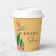 Diese farbenfrohe tropische Blumen und tropische Farbe Hintergrund Brautdusche Einladung. Das Design besticht durch ein elegantes Bouquet mit klassischen Strandfarben und Blume, darunter rosafarbener Hibiskus, orangefarbene und blaue Paradiesvögel, grüne Vegetation und dunkelgrünes Palmenblatt.