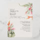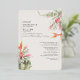 Modernes Design mit tropischer Vegetation und Blume in gedämpften Farbtönen und eine Touch Rose Gold über ein Elfenbein - cremefarbener Hintergrund kombiniert mit einer eleganten Kalligraphie Typografie, für einen schicken Look. Auf der Rückseite ist die Einladung mit einer Vorlage für Ihre Hochzeitsdetails und UAWG QR-Code beendet. Wählen Sie zwischen Gold, Rose oder Silberfolie.
