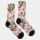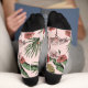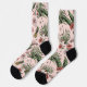 Die farbenfrohen, rosa Flamingo-Socken sind mit einem Blumenmuster aus handgezeichnet rosa Flamingos, Hibiskus- und Jasmin-Blume, Ananas, Bananen-Blätter und tropischen Getränken in einem eleganten, rosafarbenen Ambiente gestaltet.