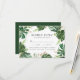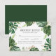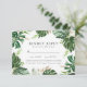 Elegante tropische Hochzeitskarten mit Ihren Hochzeitsdetails und Menüauswahl, umgeben von Aquarellmonstera-Blätter und Imitaten mit Goldfolie und grünem Blattwerk. Die Hochzeitskarten kehren zu einem soliden tropischen Hintergrund zurück. Entworfen, um mit unserer Tropical Gold Hochzeitskollektion zu koordinieren.