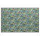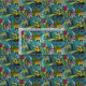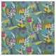 Ein helles tropisches Blumenmuster in den Farben Blau, Grün, Gold und Rosa.