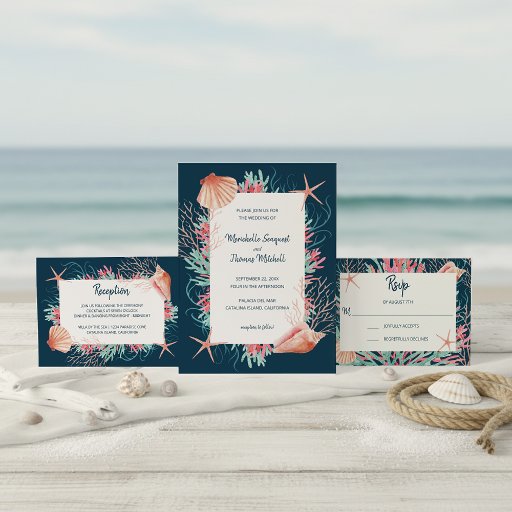 Die Themenkarte zum Thema "Unter dem Meer" enthält ein farbenfrohes Korallenriff und Muscheln (Seesterne, Konch- und Jakobsmuscheln) in Aquablau, Minze, Korallen und Rosa auf einem tiefblauem marineblauen Hintergrund. Personalisieren Sie Ihre Hochzeitsdetails wie Hotelunterkunft, Hochzeitswebsite, Begrüßungs-Empfang, etc.). Koordiniert mit meiner Kollektion "Tropical Reef" und ist perfekt für Strand-, Ozean-, Wassersport-, Küsten- und Hochzeit in Urlaubsort-Themen. Original-Kunstwerk KL Stock